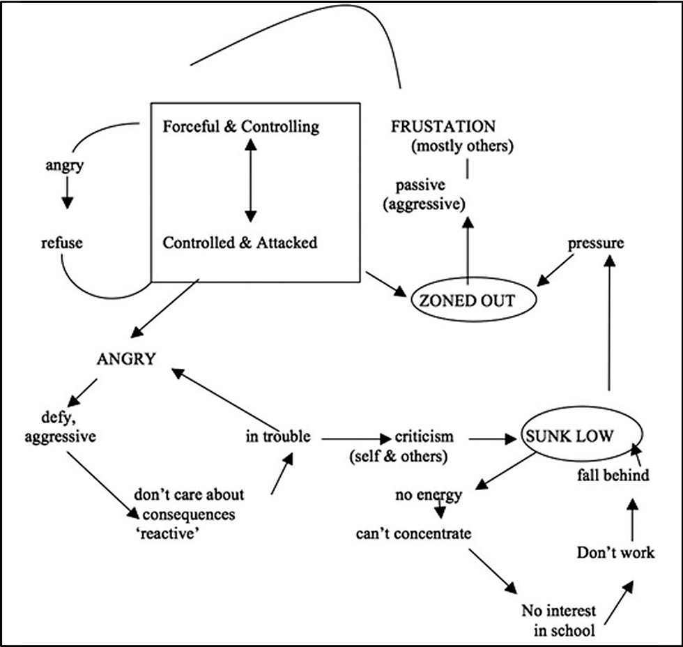Given Sam’s core reciprocal role he was sensitive to authoritarian environments and may have been likely to experience (or misinterpret) authoritative as authoritarian, himself feeling powerless, thus responding oppositionally to gain control and inviting others to become ‘controlling and forceful’. However, Sam wanting (or needing) more control and in trying to move out of feeling ‘trapped’ pulls others to impose more rules and limits, and further contributes to him feeling ‘trapped’ and wanting (or needing) more control. The aim of therapy with this model is to promote self-awareness through mapping these reciprocal role procedures (RRP); or the mechanics of what happens when we move from one relational stance to another. In mapping, it becomes clearer how specific behaviours, thoughts and feelings (or procedures) are intended to provide ‘a way out’ of an uncomfortable (or intolerable) self-state. However, when there are limited internalised reciprocal roles, there are limited reciprocal role procedures (RRP) leading to greater enactment and perpetuation of disruptive behaviours (and confirmation of the restricted stances).
